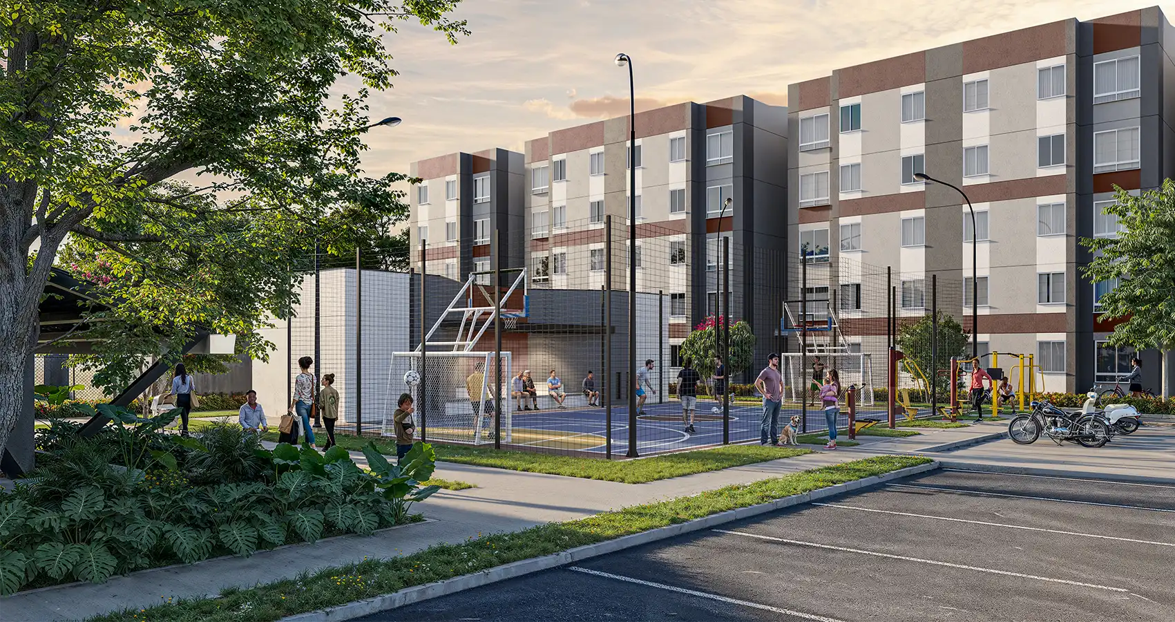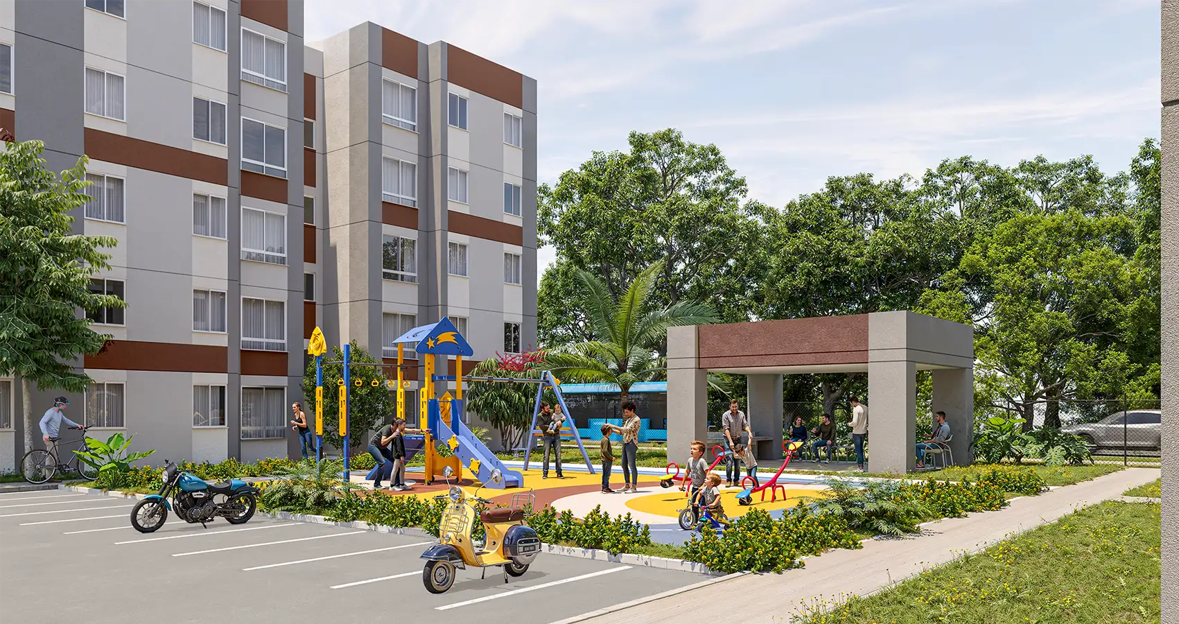 Apartamentos VIP en torres de 5 pisos, diseñados para brindar comodidad, bienestar y momentos de esparcimiento. Cuenta con zonas comunes como quiosco, espacio para sancocho, juegos infantiles, cancha múltiple y piscinas para adultos y niños. También dispone de parqueaderos comunes para motos, carros y visitantes, lo que facilita el acceso y la movilidad.