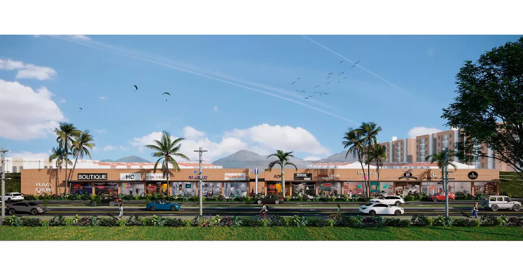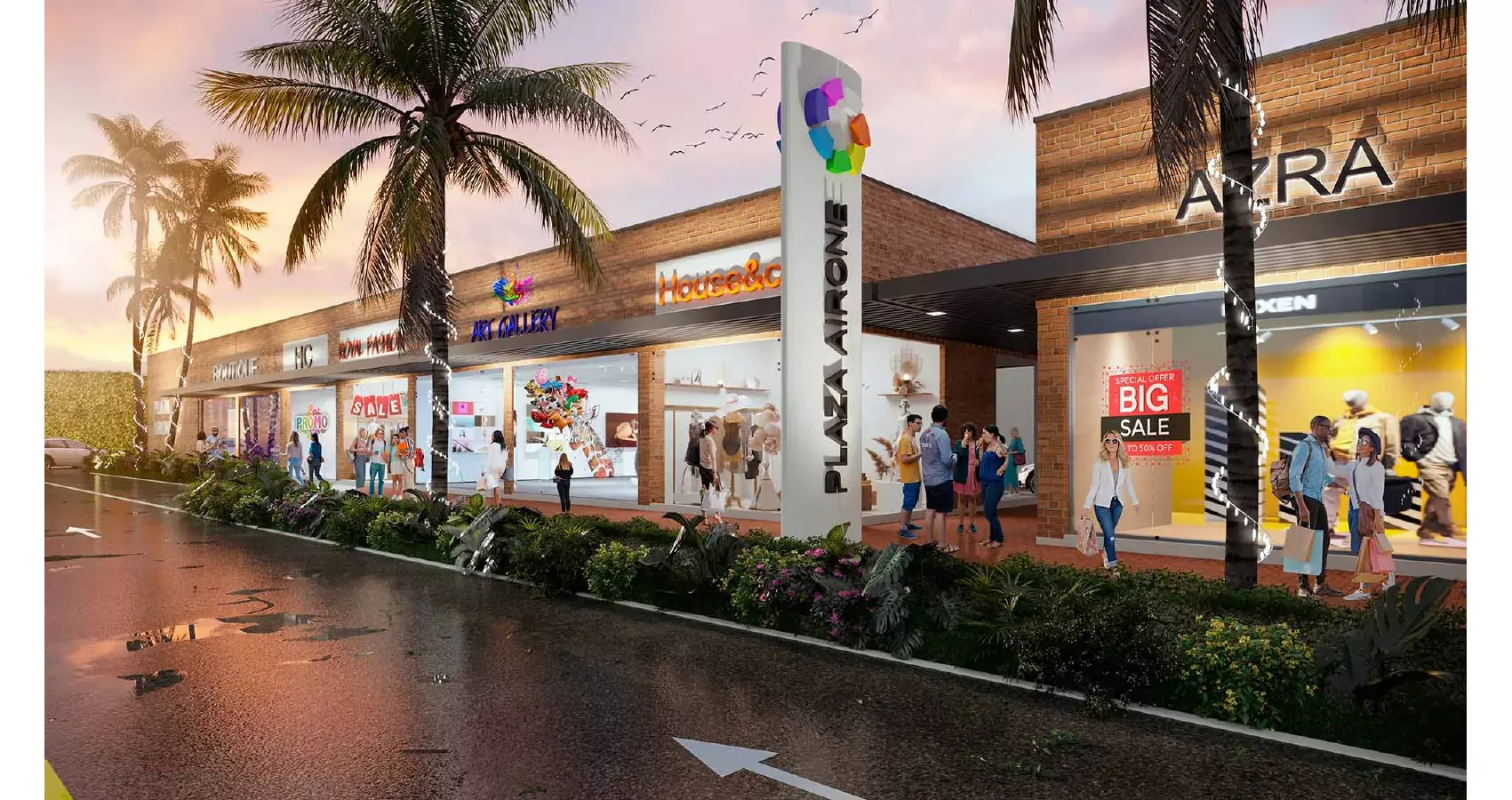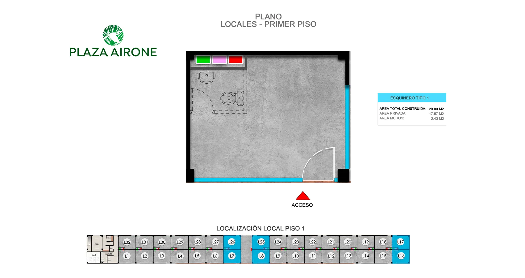 PLAZA AIRONE, Es un proyecto de locales comerciales en urbanismo abierto, en un piso de altura, el cual se desarrolla en un predio de 2098,56 m2 aproximadamente. Está conformado por 32 locales comerciales con áreas desde los 20 m2 construidos, administración, baños de hombres, mujeres y PMR, zona de descargue, UAR, planta de emergencia (respaldo de zonas comunes) y cuarto de seguridad.