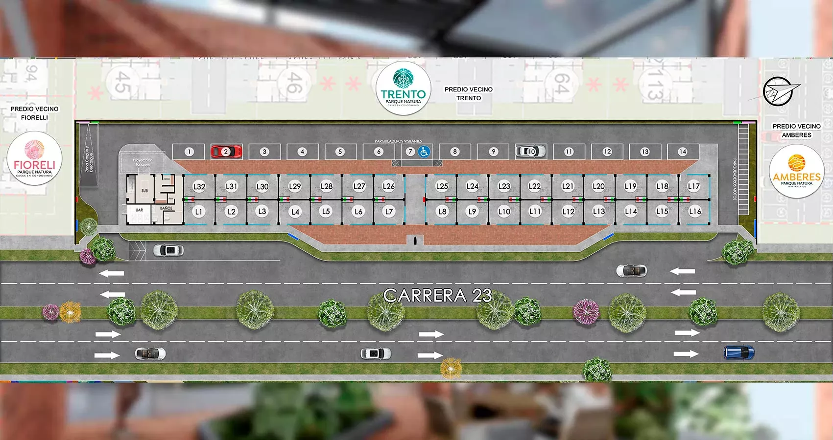 El acceso vehicular y peatonal principal es por la carrera 23, cuenta con una via de servicio posterior y bahía sobre la cual se localizan los 14 parqueaderos vehiculares para visitantes dentro de los cuales hay un parqueadero PMR. También cuenta con 18 parqueaderos para motos.
