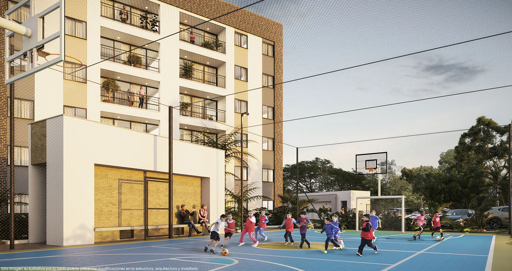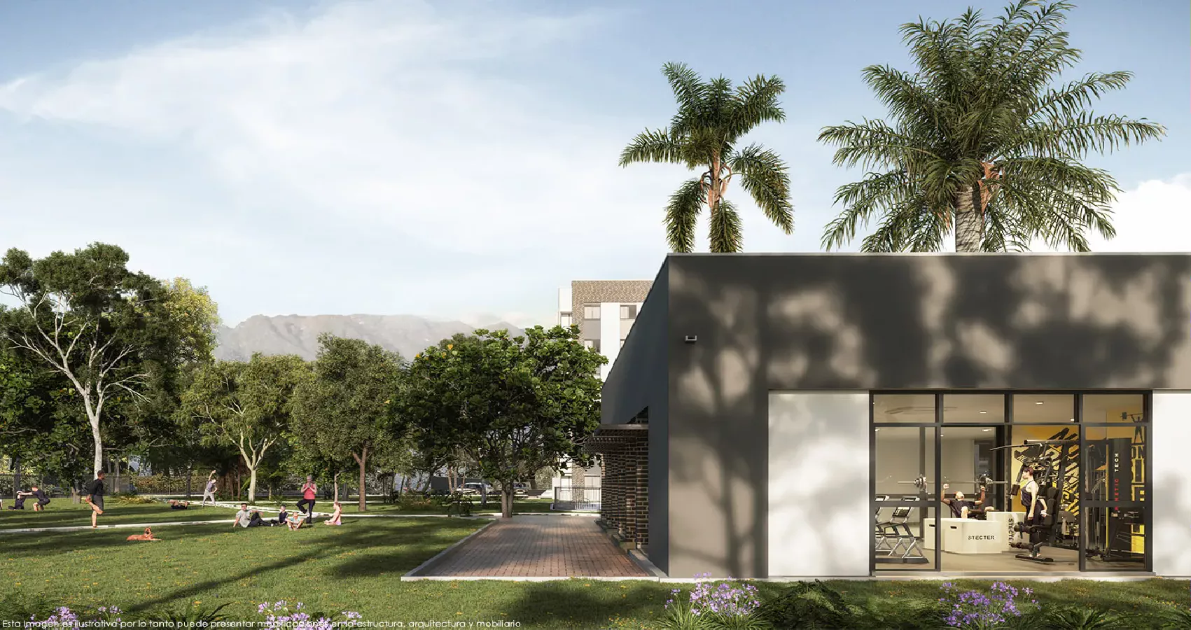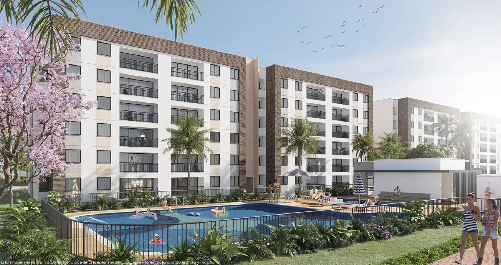 Conformado por torres de 6 pisos con ascensor, parqueaderos propios. Disfruta de la diversidad de zonas comunes que diseñamos como piscina para adultos y para niños, turco y gimnasio, salón social con zona BBQ, cancha múltiple y zona de juegos infantiles, además de contar con circuitos de andenes que permiten recorrer todo el conjunto; una alameda de palmas como eje central del recorrido resaltando la exuberancia de sus jardines internos.